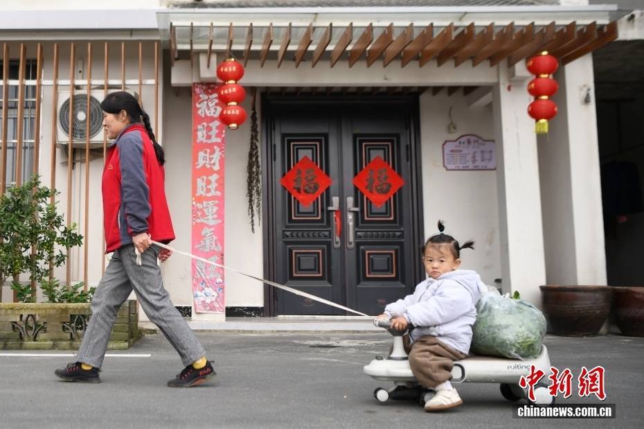 自南水北调中线工程核心水源地丹江口水库出发,沿公路行驶不久,便可抵达湖北省丹江口市三官殿街道蔡湾村。放眼望去,民居白墙灰瓦鳞次栉比,不远处蔬菜大棚错落有致,一幅幅田园新景映入眼帘。这个距丹江口大坝仅500米的“坝首第一村”,曾是南水北调中线工程最后一批移民离岸村落。14年前,为配合南水北调中线工程建设,数十万民众挥别故土,迁往他乡。蔡湾村也迎来一批集中安置移民。在北京的帮扶下,蔡湾村把曾经的荒田盘活,建成南水北调数字设施农业科技示范园。园区通过土地流转、大棚承包、合作社分红等方式,帮助村民增收致富。昔日的移民安置点,走过一条从“离乡”到“安居”的蜕变之路。图为10月22日,蔡湾村村民带孩子散步。中新社记者 杨华峰 摄