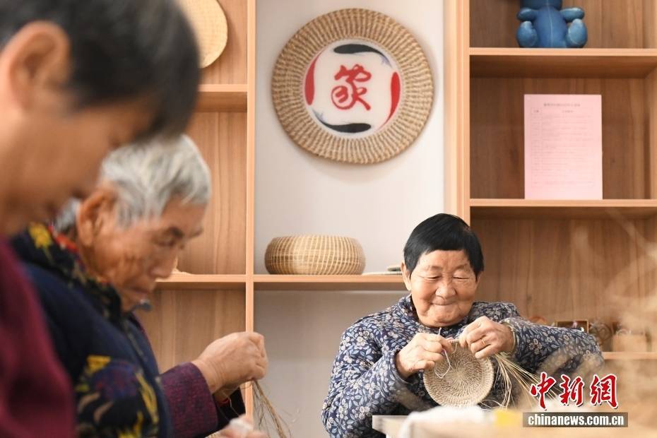 自南水北调中线工程核心水源地丹江口水库出发,沿公路行驶不久,便可抵达湖北省丹江口市三官殿街道蔡湾村。放眼望去,民居白墙灰瓦鳞次栉比,不远处蔬菜大棚错落有致,一幅幅田园新景映入眼帘。这个距丹江口大坝仅500米的“坝首第一村”,曾是南水北调中线工程最后一批移民离岸村落。14年前,为配合南水北调中线工程建设,数十万民众挥别故土,迁往他乡。蔡湾村也迎来一批集中安置移民。在北京的帮扶下,蔡湾村把曾经的荒田盘活,建成南水北调数字设施农业科技示范园。园区通过土地流转、大棚承包、合作社分红等方式,帮助村民增收致富。昔日的移民安置点,走过一条从“离乡”到“安居”的蜕变之路。图为10月22日,蔡湾村老人用龙须草编织文创产品。中新社记者 杨华峰 摄