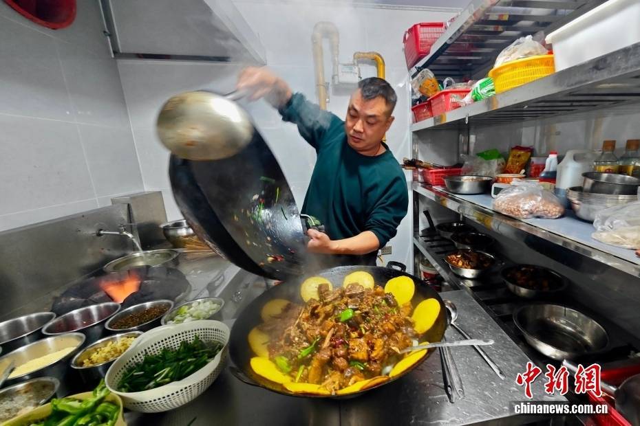 自南水北调中线工程核心水源地丹江口水库出发,沿公路行驶不久,便可抵达湖北省丹江口市三官殿街道蔡湾村。放眼望去,民居白墙灰瓦鳞次栉比,不远处蔬菜大棚错落有致,一幅幅田园新景映入眼帘。这个距丹江口大坝仅500米的“坝首第一村”,曾是南水北调中线工程最后一批移民离岸村落。14年前,为配合南水北调中线工程建设,数十万民众挥别故土,迁往他乡。蔡湾村也迎来一批集中安置移民。在北京的帮扶下,蔡湾村把曾经的荒田盘活,建成南水北调数字设施农业科技示范园。园区通过土地流转、大棚承包、合作社分红等方式,帮助村民增收致富。昔日的移民安置点,走过一条从“离乡”到“安居”的蜕变之路。图为10月22日,蔡湾村农家乐工作人员为游客烹制美食。中新社记者 摄